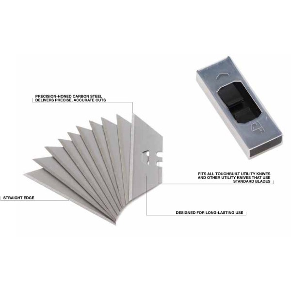 ToughBuilt® Utility Knife Blades keep your utility knife working optimally throughout the most rigorous jobs. Made from durable, precision-honed carbon steel to provide long-lasting use. The straightedge blades deliver precise and accurate cuts on a variety of materials including carpet, cardboard, drywall, leather, rubber, vinyl flooring and more.