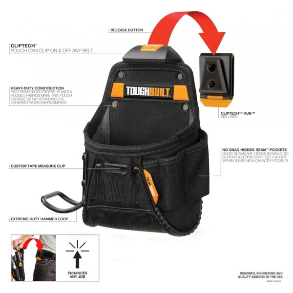 The ToughBuilt® Project Pouch with Hammer Loop transforms how professionals carry tools. The patented ClipTech™ Hub™ allows the pouch to clip on and off any belt so it is carried only when it is needed or when it is the only thing you need.