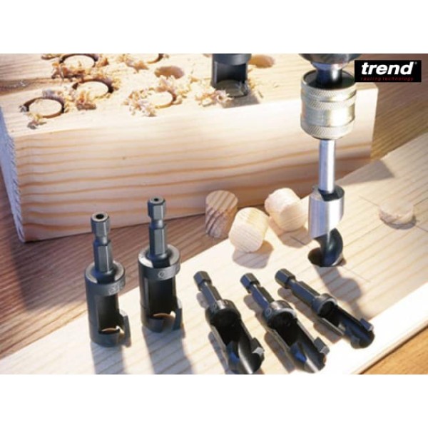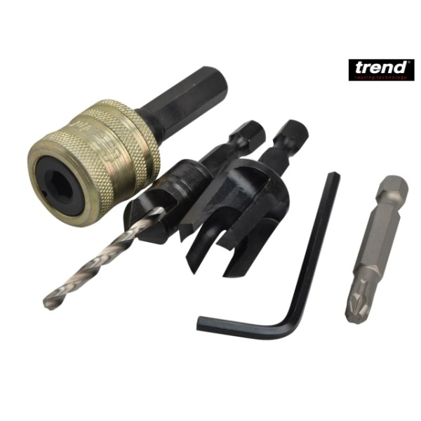 Plug cutter set for No.12 screw size. The set comprises Quick Chuck, Drill/Countersink,Pozi Screwdriver bit and standard Plug cutter