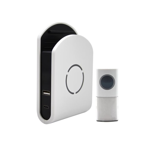 Uni-Com Plug-in Door Chime with USB-A and USB-C ports plus handy shelf to hold your mobile phone while charging. Ideal for use around the home, plugs into any 13A socket around your home. The door chime is wireless, so no wiring is required, and with an extensive operating range of up to 200m, you never have to miss a visitor or delivery. The bell push is water resistant (IP44 rated).