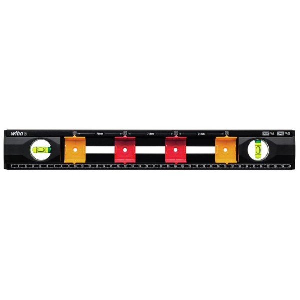 The Wiha Electrician's Spirit Level is built for measuring and marking vertical and horizontal distances between flush boxes. End-to-end casing allows electricians to mark out lines without needing to stop. The ingeniously positioned linear scales ensure users can measure in comfort, even when viewing from above. Both level bubbles can be seen easily, even from an acute angle.