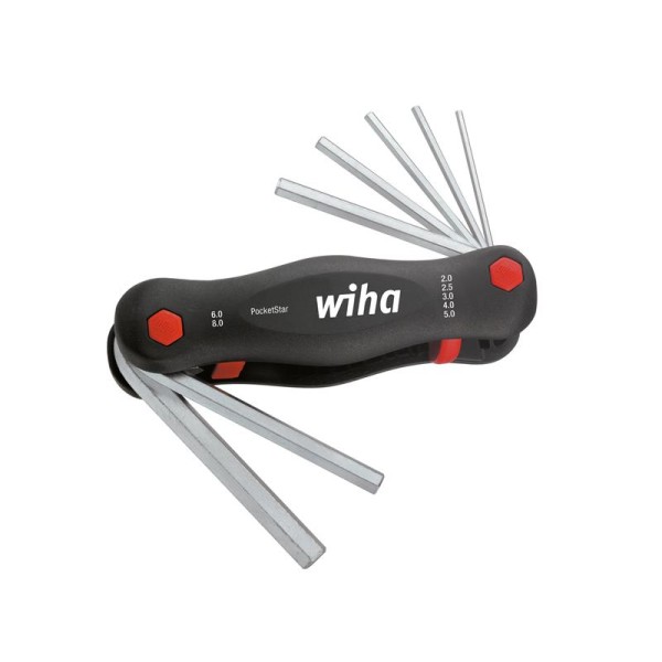 This Wiha PocketStar has seven hex L-keys made of through hardened, Chrome-vanadium steel with an electro-plated finish. Stored in a handy, space-saving folding holder.